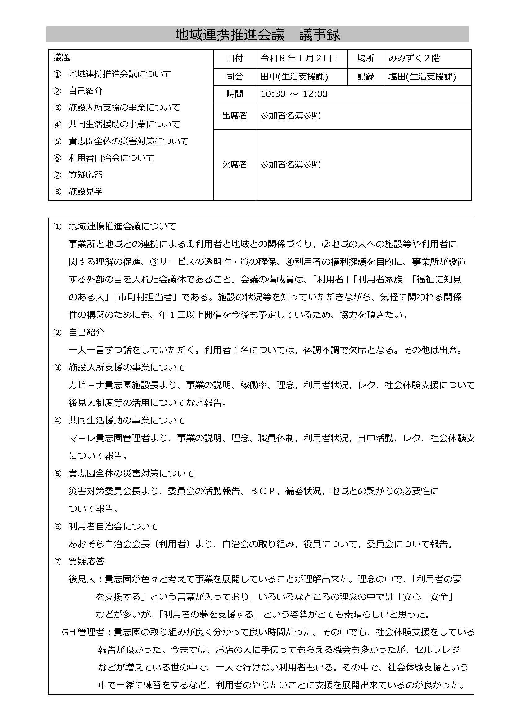 施設等と地域が連携する事によって施設のことを地域に知って頂くとともに、施設と地域との繋がりをより深くしていく事を目的に会議を開催しています。